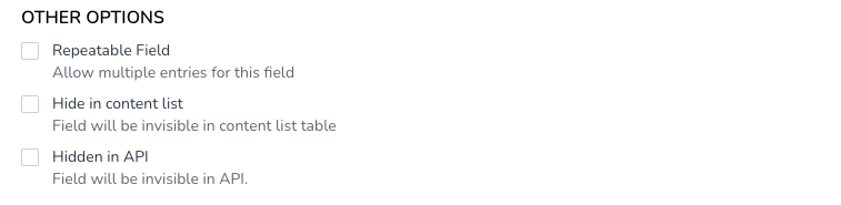 Repeatable Field: Allows multiple entries for the field. It's available for text, longtext, email, number, color, date and time field types.