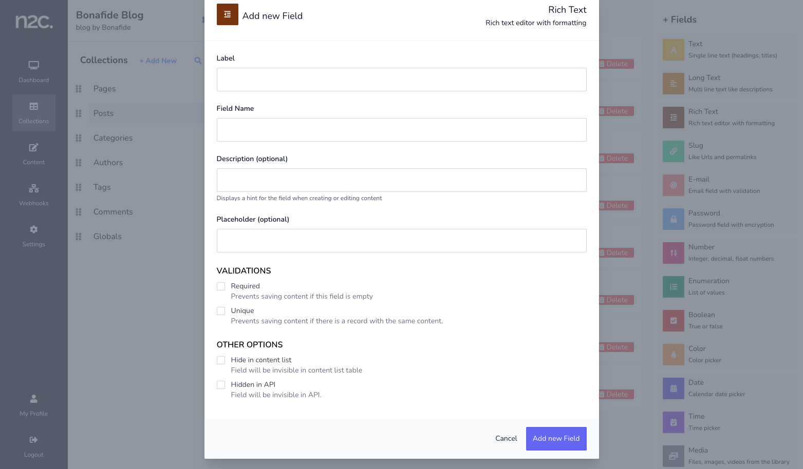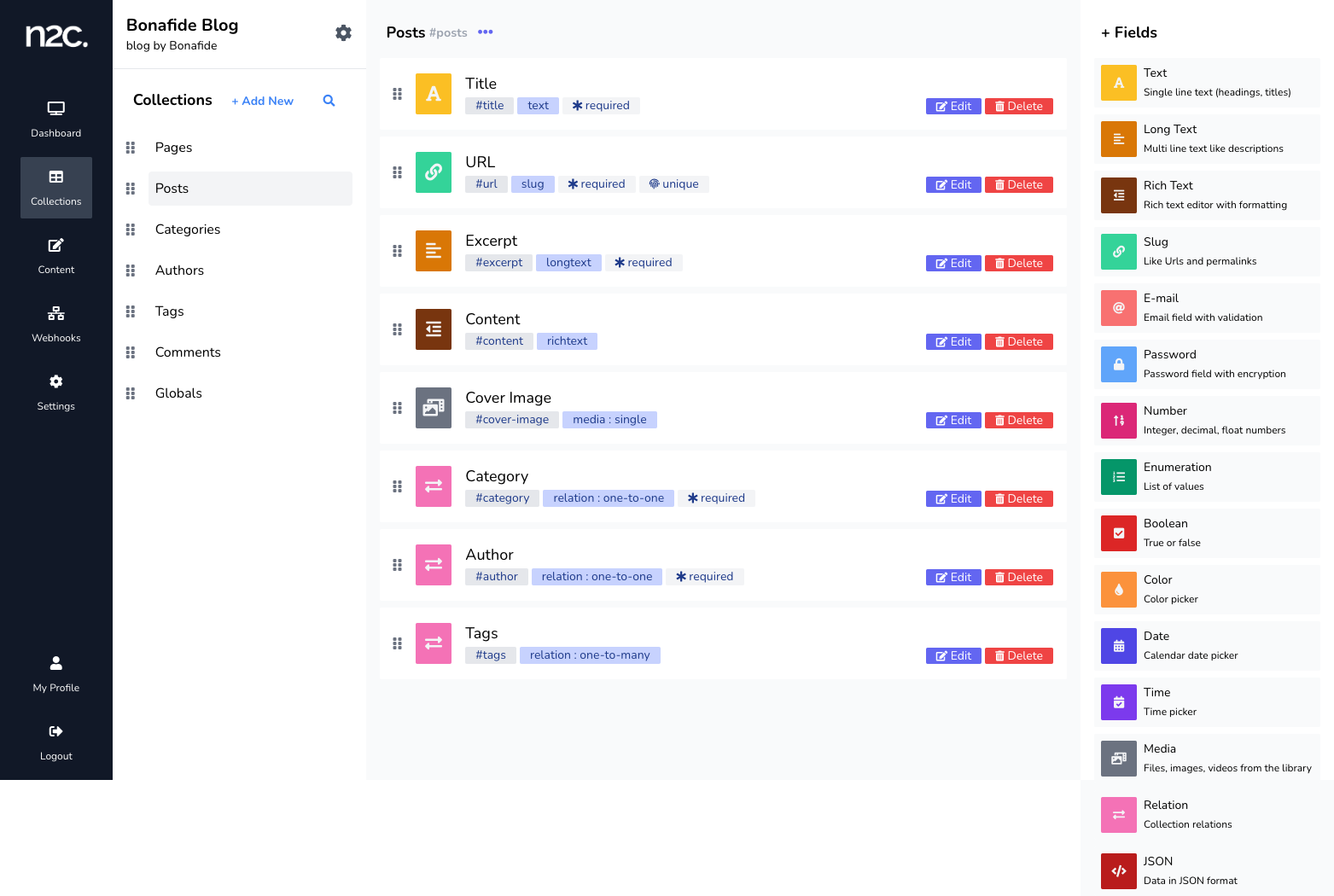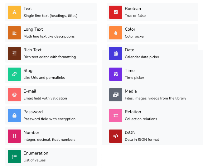 Collections are where you can create your schema for your content. Inside the collections module you can create new collections and add fields. All changes to your collections are immediately avaible in content managing view.