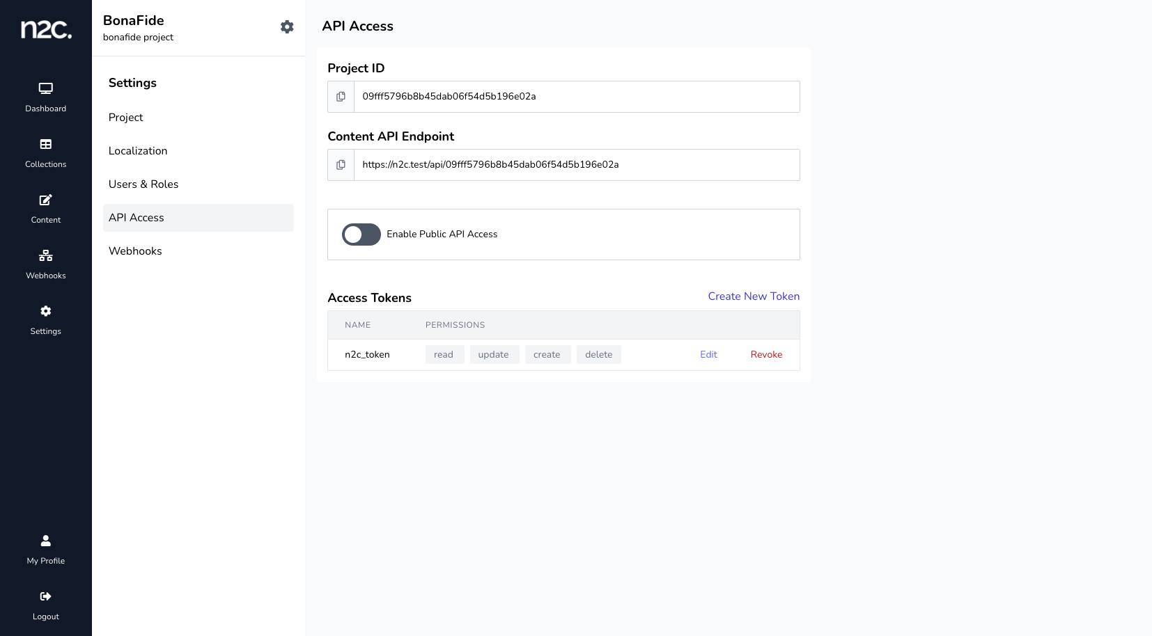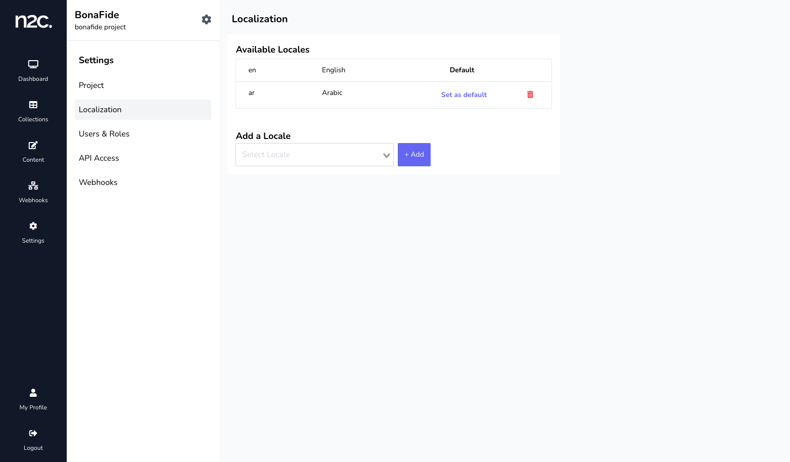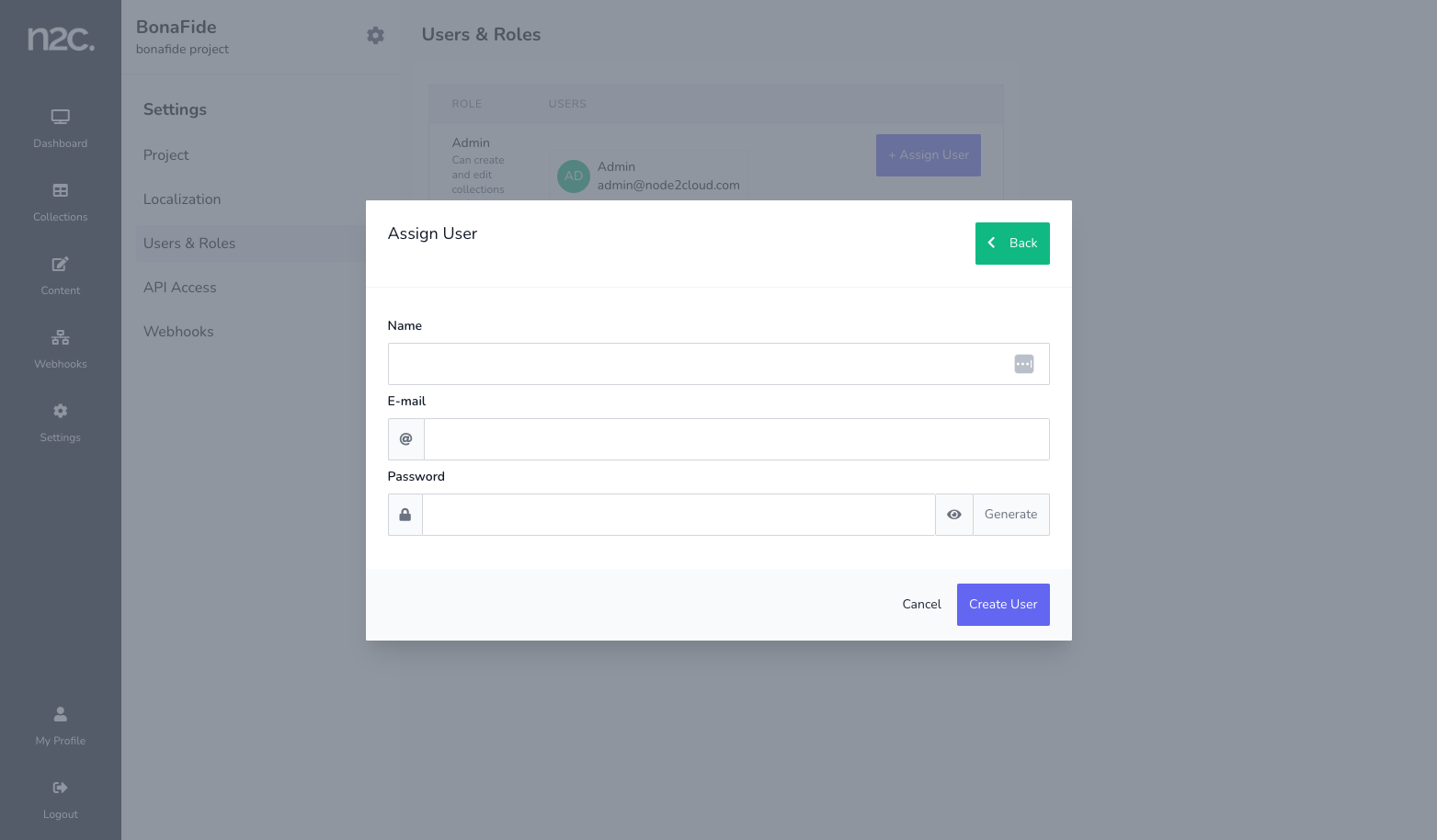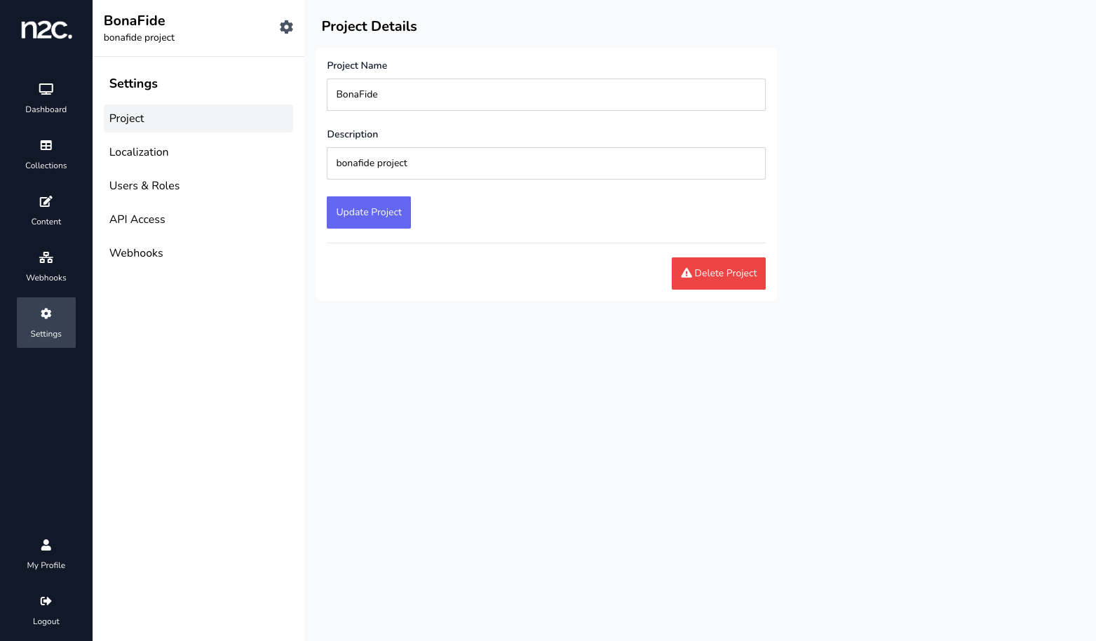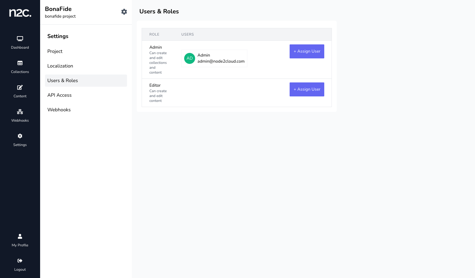 In this section you can manage user access to your your project. There are two roles you can use. Admin roles can manage project collections and content. Editors can only manage content. Super admin accounts have the admin role for all your projects.