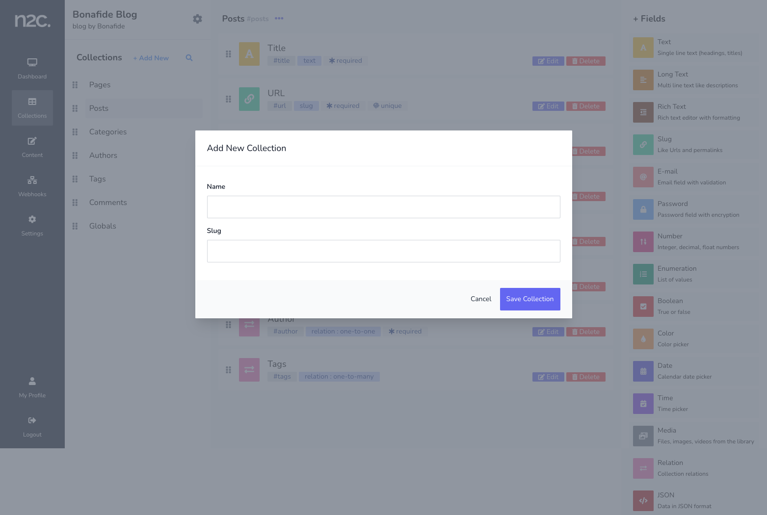 To create a new collection simply use the Add New button. Name your collection and the slug will be created. You can change the slug if you want to.
