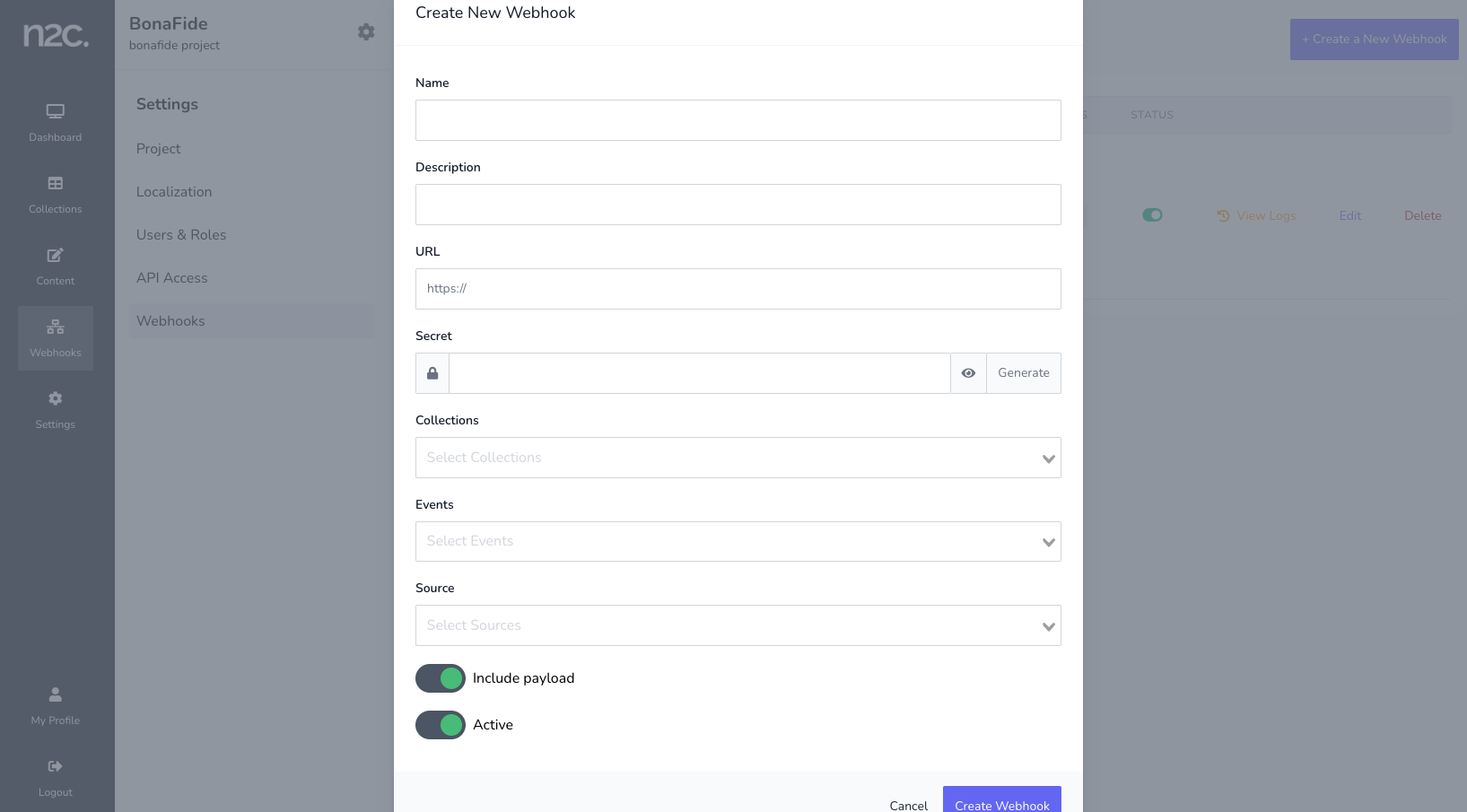 - Active. You can enable or disable your webhooks. This may be useful when you don't want to delete the webhook.